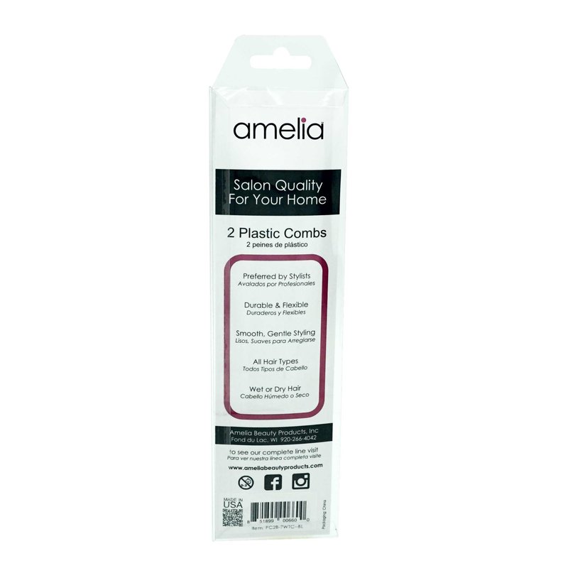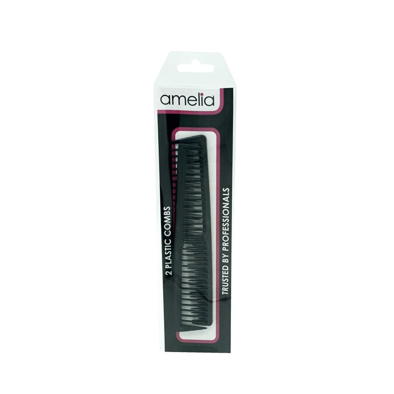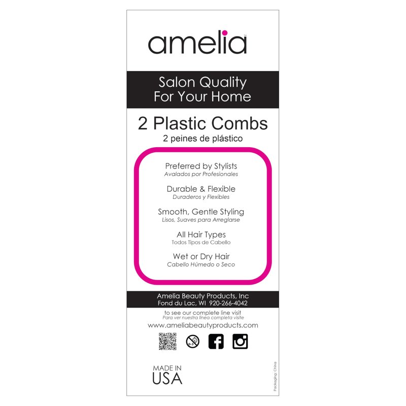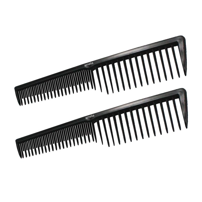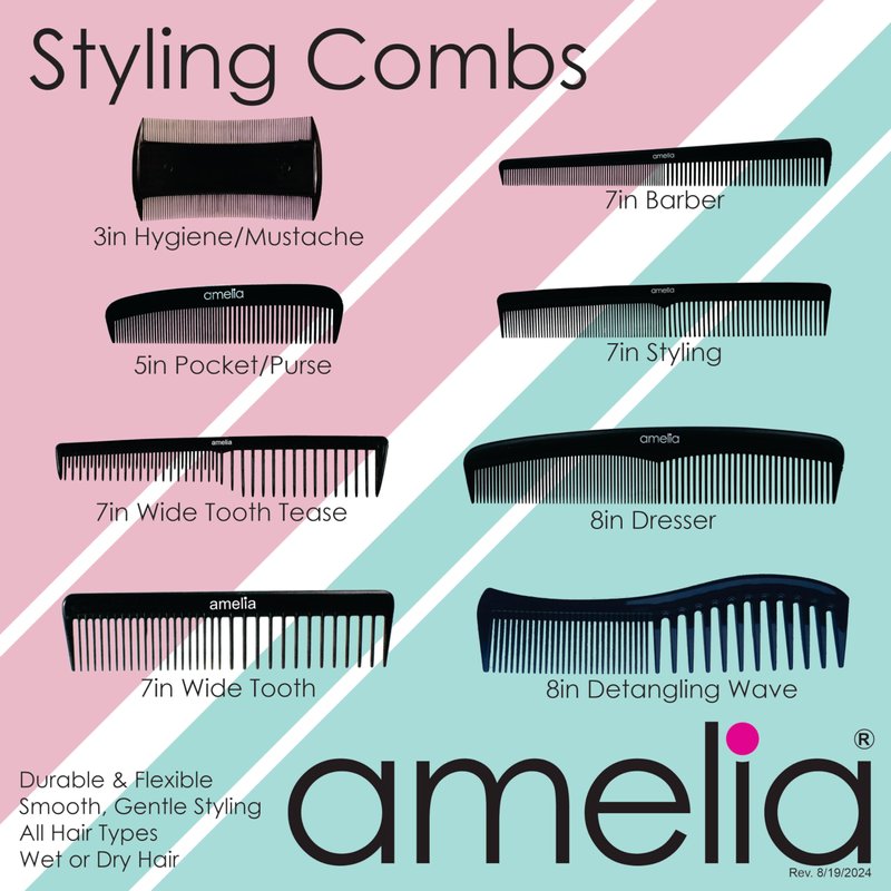 Amelia Beauty, 7in Black Plastic Wide Tooth Tease Comb, Made in USA, Professional Grade Pocket Hair Comb, Wet, Tangled Hair, Flip to Lift, Tease, Everyday Styling Cutting Hair Styling Tool, 2 Pack