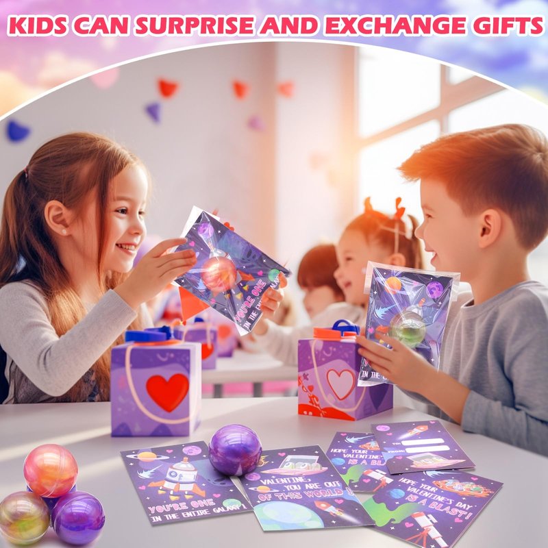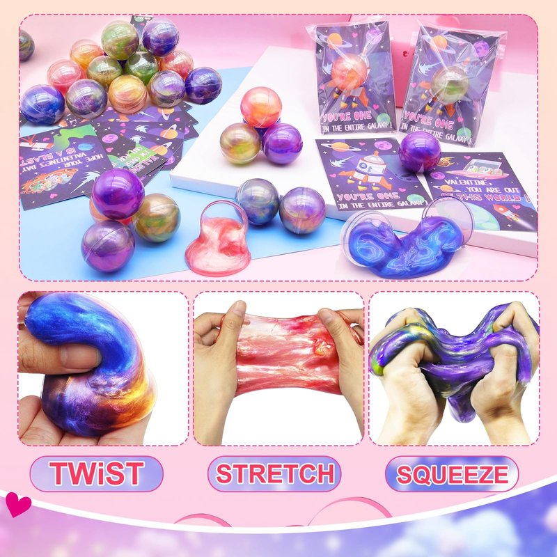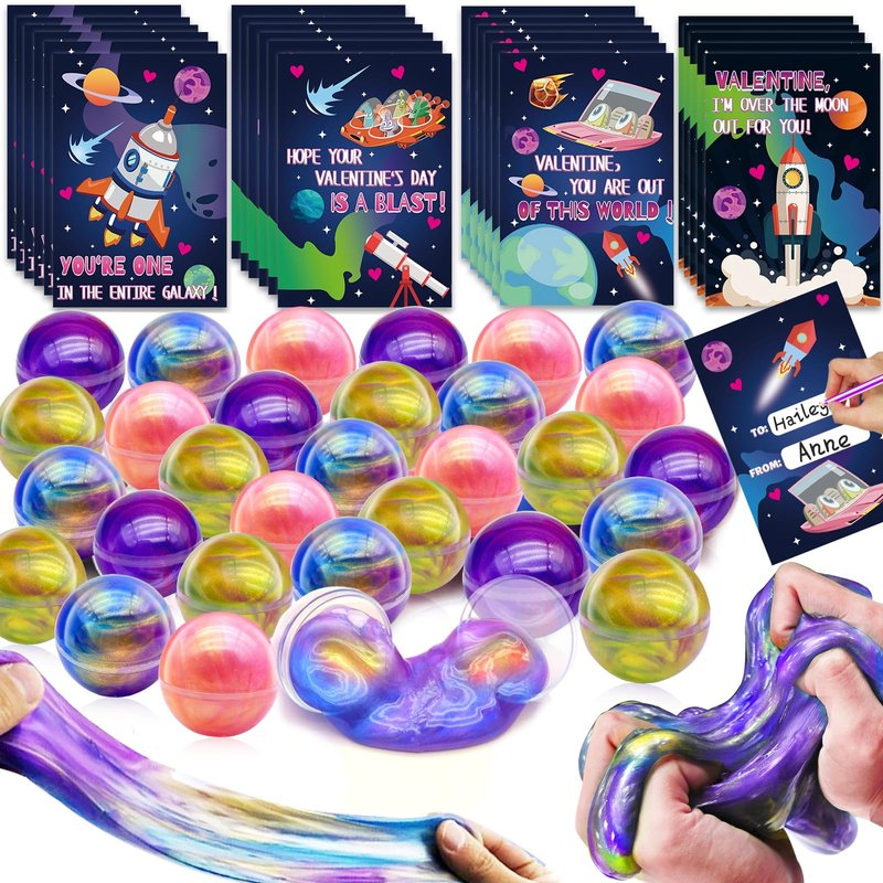 - 【Valentine's Day Super Value Gift Package】 The set includes: 24 galaxy round slime balls kits (4 multiple colors:green,pink,purple,blue,each of 6), and 24 4.8 inch starry space-themed cards in 4 different designs,24 transparent bag.Kids can write blessings on the cards, making it a fantastic choice for a Valentine's Day gift.Ideal for boys and girls as Valentine's Day gifts.Comes with a transparent bag, you can put toys and cards inside and give it to your friends or classmates, or anyone you'd like to gift it to.