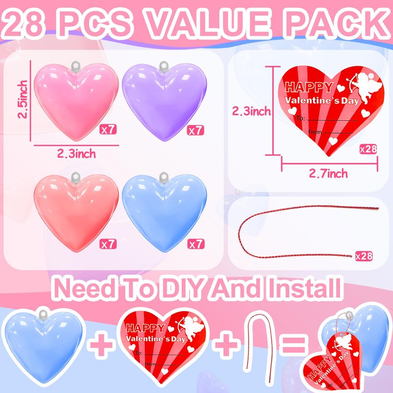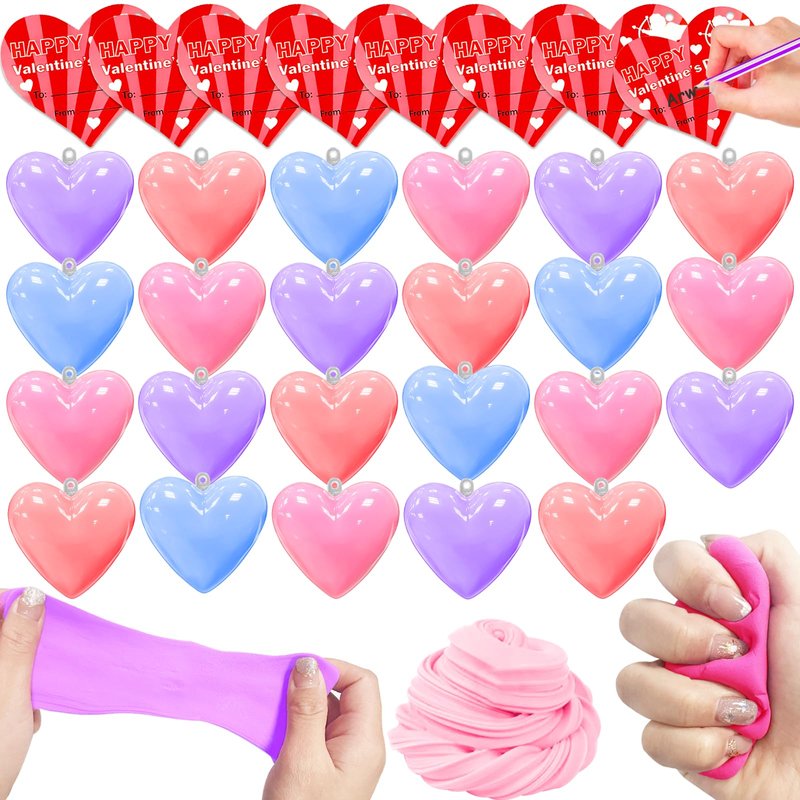 - 【28 Pack Valentine DIY Slime Filled Hearts Set】Includes 28 sets of hearts-shaped butter slime in 4 different colors:red,pink,blue,purple,each colors 7pcs. and 28 Valentine's Day red hearts cards and 28 red ropes.Each hearts butter slime is filled packaged in a transparent box, with a size of 2.3inch*2.5 inch(L*W) A delightful Valentine's Day toy set, perfect for gifting to friends or classmates.