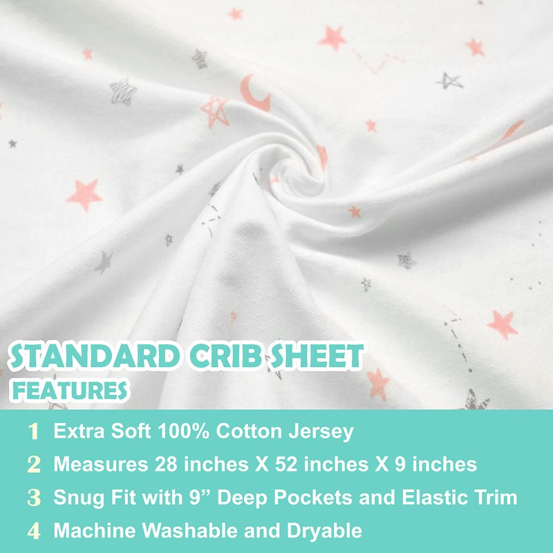 - Quality Cotton Jersey Design: Crafted from premium 100% Cotton Jersey, these sheets prioritize your baby's comfort and safety. With a snug fit and durable, machine-washable fabric, they maintain quality, lasting shape, and enduring durability.
