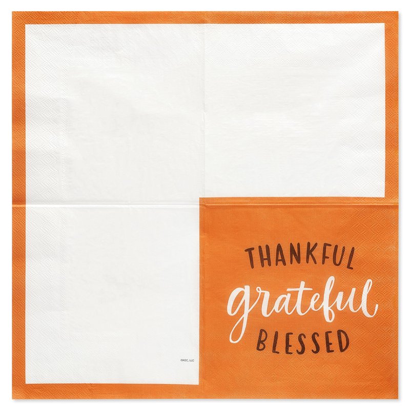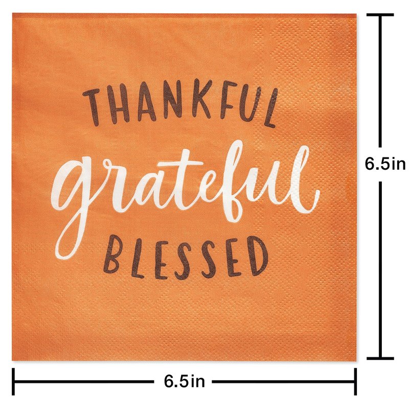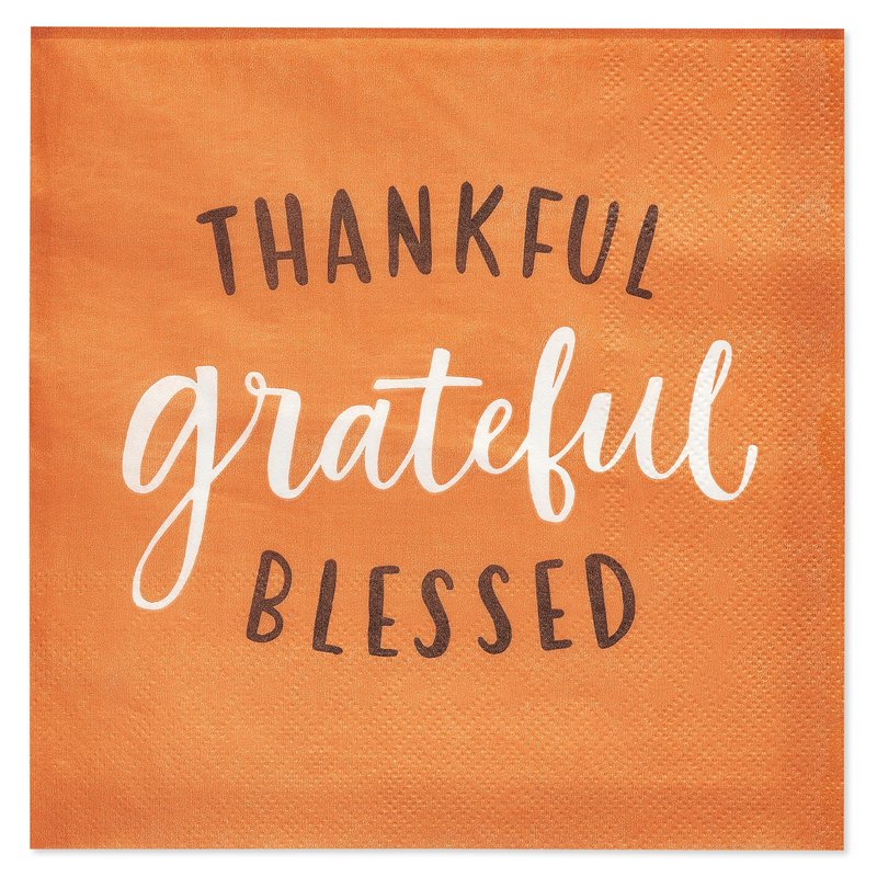 - These lunch napkins read “Thankful, Grateful, Blessed” in a hand-lettering in the design