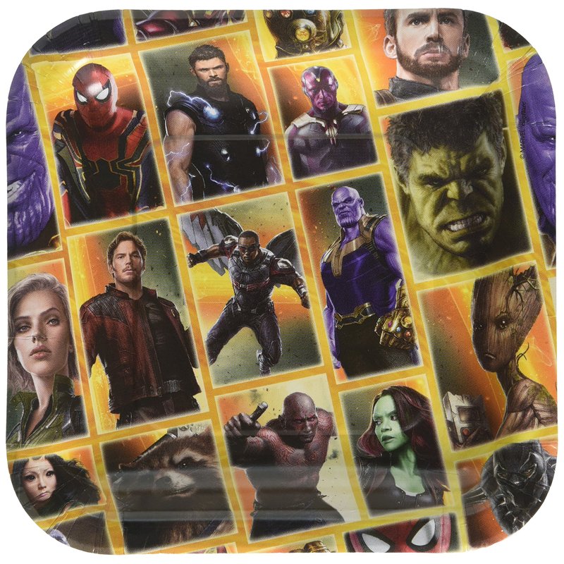 - Avengers: Infinity Wars square dessert plates feature a colorful grid pattern with images of Captain America, Black Widow, Hulk and other characters