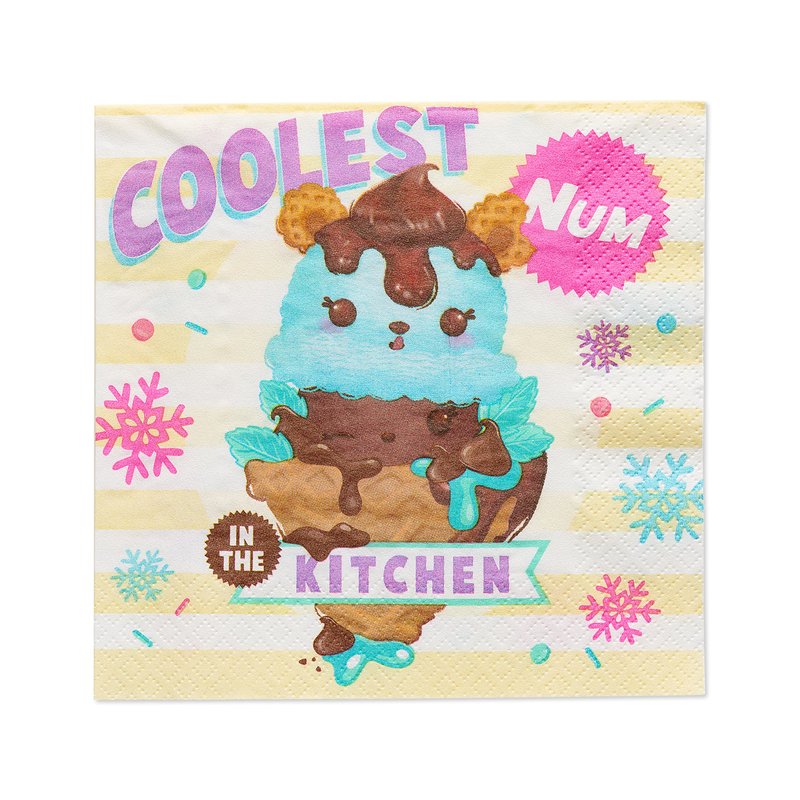 - Num Noms lunch napkins feature ice cream characters sprinkled with cuteness on a yellow striped background