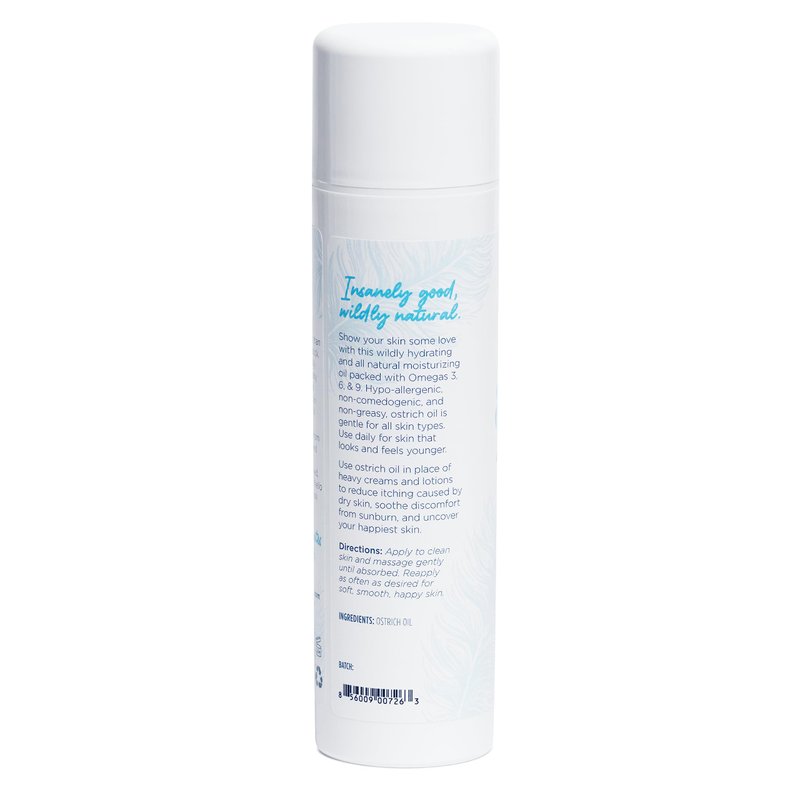 Show your skin some love with this wildly hydrating and all natural moisturizing oil packed with skin-loving Omegas 3, 6, & 9. Hypoallergenic, non-comedogenic (that's fancy talk for “won't clog pores"), and non-greasy, ostrich oil is gentle for all skin types. Very similar in structure to the oils produced by your own skin, ostrich oil is absorbed very quickly. This whole oil undergoes minimal processing and is free from parabens, phthalates, and other funky junk. Say goodbye to old-fashioned, synthetic skin care and hello to a future we can all look forward to.