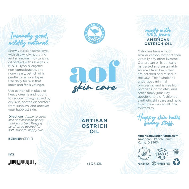 - ALL NATURAL - Happy skin hates funny stuff, which is why you'll never find anything artificial in our products, made with 100% pure Ostrich Oil sourced from our farm in Boise, Idaho. No parabens, phthalates or other additives. Our natural skin softener is hypo-allergenic, non comedogenic, non-greasy, fast absorbing, and gentle for all skin types. Apply as is, or use as a carrier for your favorite essential oil or to boost the efficacy of your favorite lotion.