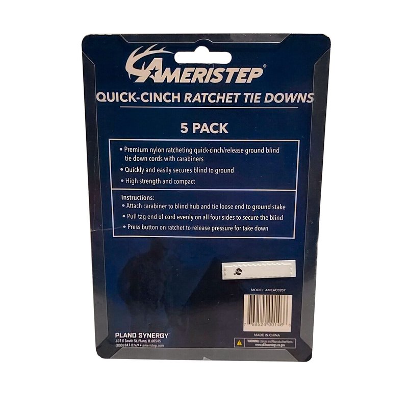 - SECURE YOUR GROUND BLIND - Keep your ground blind in place with Ameristep Quick-Cinch Ratchet Tie-Downs 5-Pack. This 5-pack of nylon ratcheting quick-cinch/release tie-down cords with carabiners make it quick and easy to secure your ground blind
