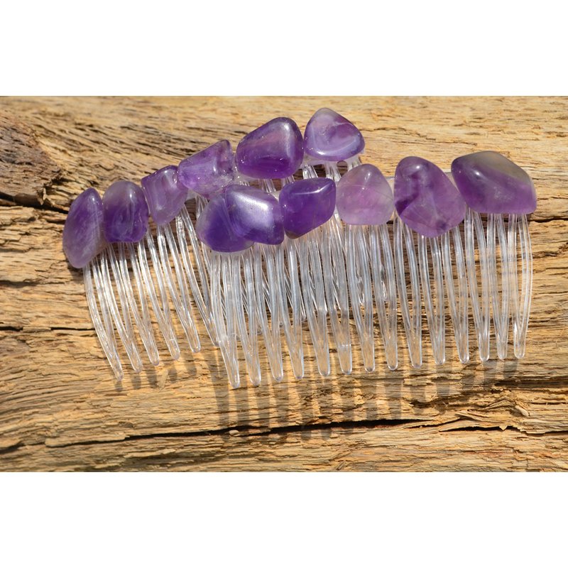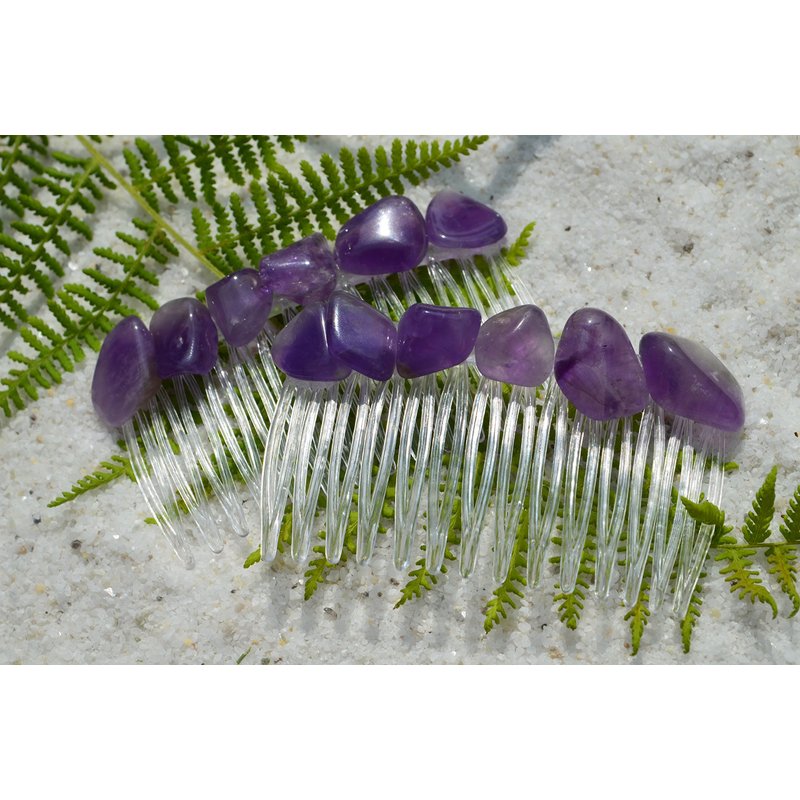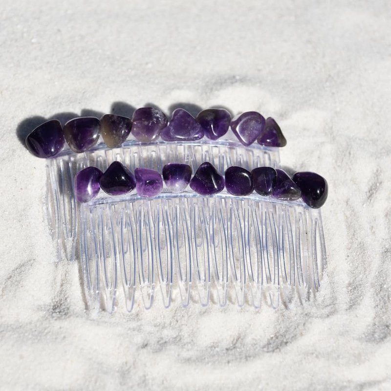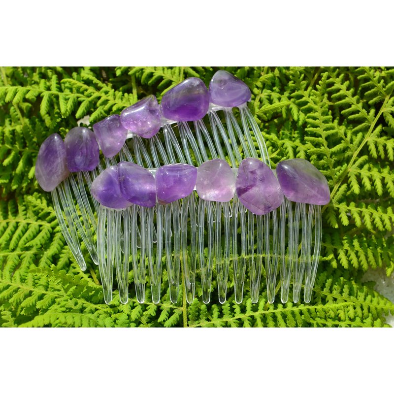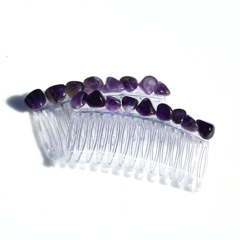 Set of 2 pretty purple amethyst stone hair combs. The amethyst stone hair combs are adorned withtumbled amethyst stones. The amethyst hair combs are the perfect accessory for a night out, and can dress up an outfit or be used for a special event, like a quinceanera, first communion, or even a wedding. The hair comb is hand made in the USA and come from a smoke free environment The amethyst hair combs measure: 67 mm x 41 mm x 7 mm or 2.65 inches x 1.6 inches x .23 inches