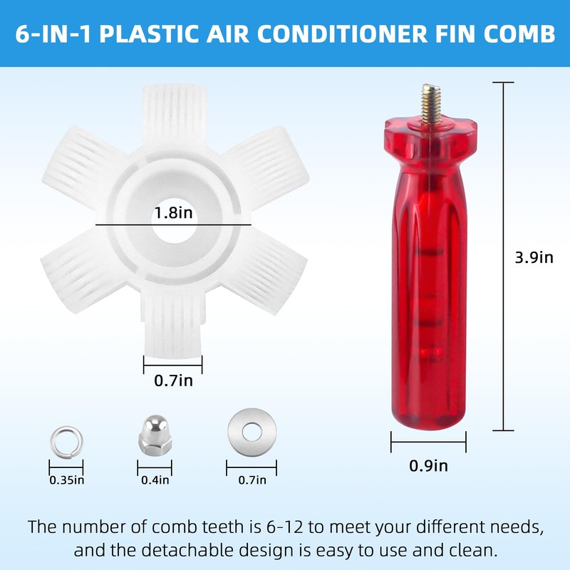 - [Fin Comb]:Stainless steel fin comb teeth are approximately 2-9/25 inches deep, rugged and adjustable for looseness and tightness so as not to damage the coils.6-in-1 plastics fin comb teeth are approximately 1/4 inch deep, it has 6 sided heads 8,9,10,12,14 and 15 fins per inch. The fin comb fixes bent fins and is easy to use, simply pass the tool through the area on the air conditioning unit where the fin is bent
