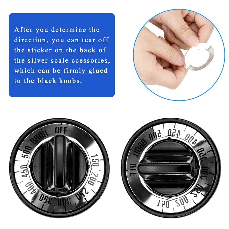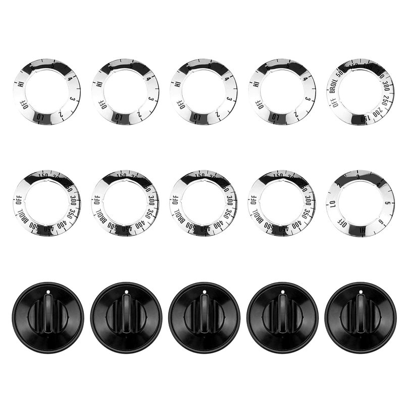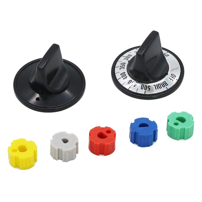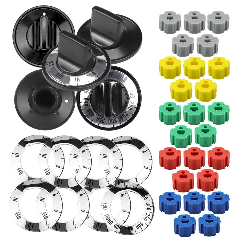- 【Package List】:Electric Range Burner Knob Kit KN002 Universal Electric Range Oven Knob Handle Kit Color Black. 4 x Surface Inlay CCW; 4 x Surface Inlay CW; 1 x Thermostat Inlay 150 degree - 500 degree w/broil; 1 x CW to ON Inlay; 5 x Knob; 5 x Blue/Green/Gray/Red/Yellow Insert.