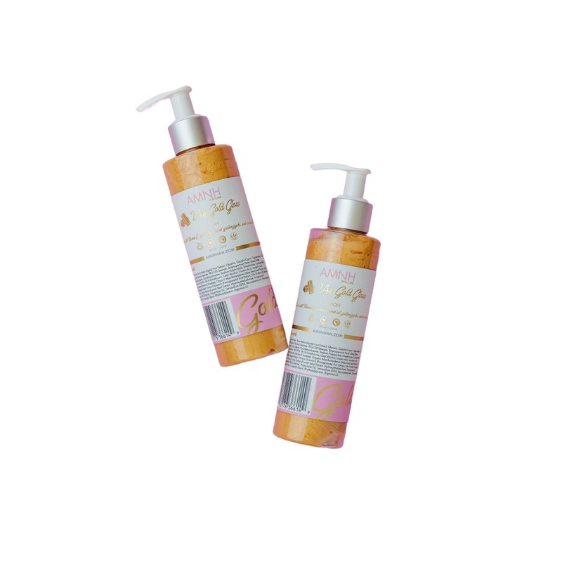 Our lotions are a great addition to your skincare routine.Made with all natural ingredients to soothe, hydrate, and nourish your skin and also leaving you with happy, healthy, deliciously smelling skin. (Vitamin E, apricot kernel oil, golden jojoba, and coconut oil) 24k Gold Glow Lotion is also drenched in 24k gold sparkles to give you that all day golden glow. How To Use: Apply desired amount to skin. Massage gently until fully absorbed. Ingredient List: Pyrus Malus (Apple) Fruit Extract, Glycerin, Caprylic-Capric Triglycerides, C12-15 Alkyl Benzoate, Glyceryl Stearate, PEG-100 Stearate, Butyrospermum Parkii (Shea) Butter, Octyldodecyl Ricinoleate, Cyclohexasiloxane, Sodium Polyacrylate, Dimethicone, Cyclopentasiloxane, Trideceth6, PEG-PPG 18-18 Dimethicone, Cety1 Alcohol, Linoleic Acid, Linolenic Acid, Tocophery1 Acetate (Vitamin E Acetate), Organic Aloe Barbadensis (Aloe Vera) Leaf Extract, Undaria Pinnatifida (Algae) Extract, Punica Granatum (Pomegranate) Fruit Extract, Vitis Vinifera (Grape) Seed Extract, Daucus Carola Saliva (Carrot) Seed Extract, Hydroxyethylcellulose, Polyglycery13 Diisostearate, TEA-Carbomer, Polysorbate 20, Tetrasodium EDTA, Benzophenone-4, Phenoxyethanol, Hexylene Glycol, Caprylyl Glycol, Ethylhexylglycerin, fragrance oil.