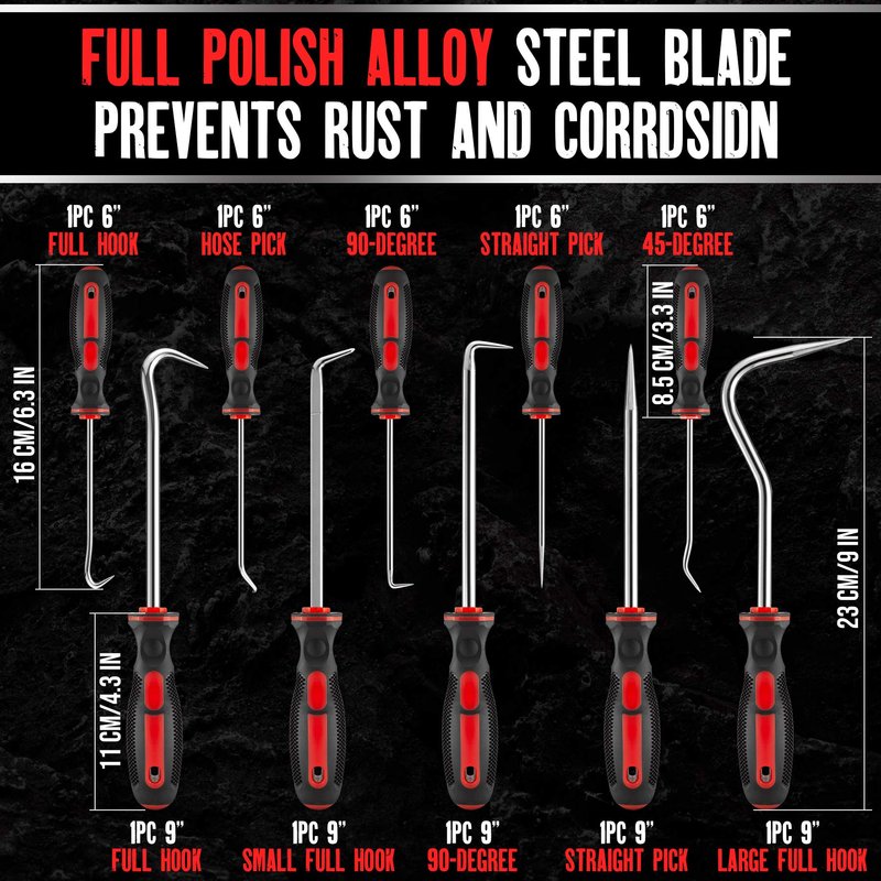 - Pick set Includes 90 Degree Hook, 90 Dagree Hook, Large Full Hook, Straight Pick, Small Full Hook, Combination Pick, Offset Pick, Hose Pick, Cotter Pick, double angle pick