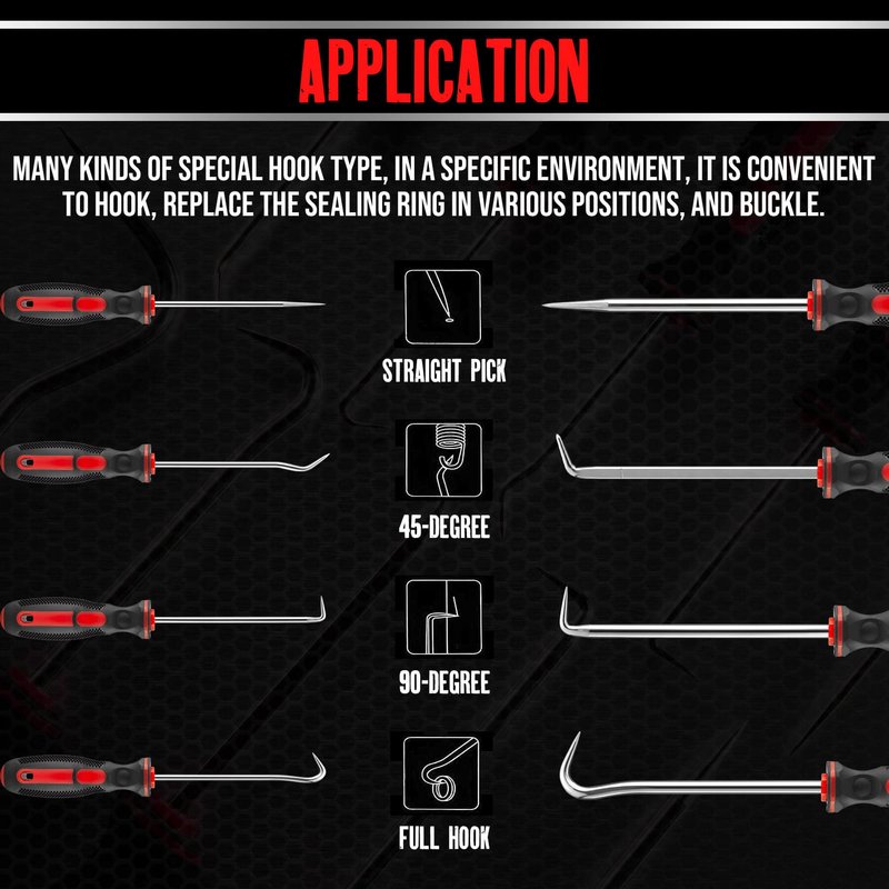 - This pick and hook set can be conveniently used for ignition system, intake valve, rifle bolt surface, seals, fuel valve O-ring, hose end O-ring and various electronic equipment. It is your right assistant for repair or disassembly.