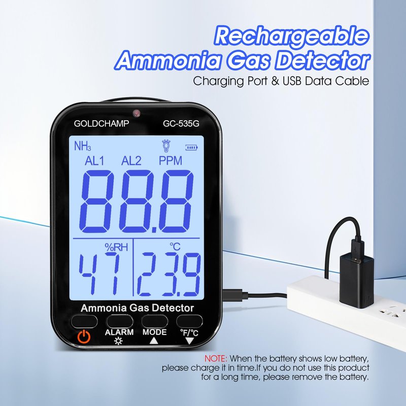 Ammonia Gas Meter NH3 Gas Monitor Sensor Range 0-100ppm, Resolution 0.1ppm with Temperature(℉/℃), Humidity, Backlight Display, Dual Alarm for Poultry, Farm, Home GC-535G