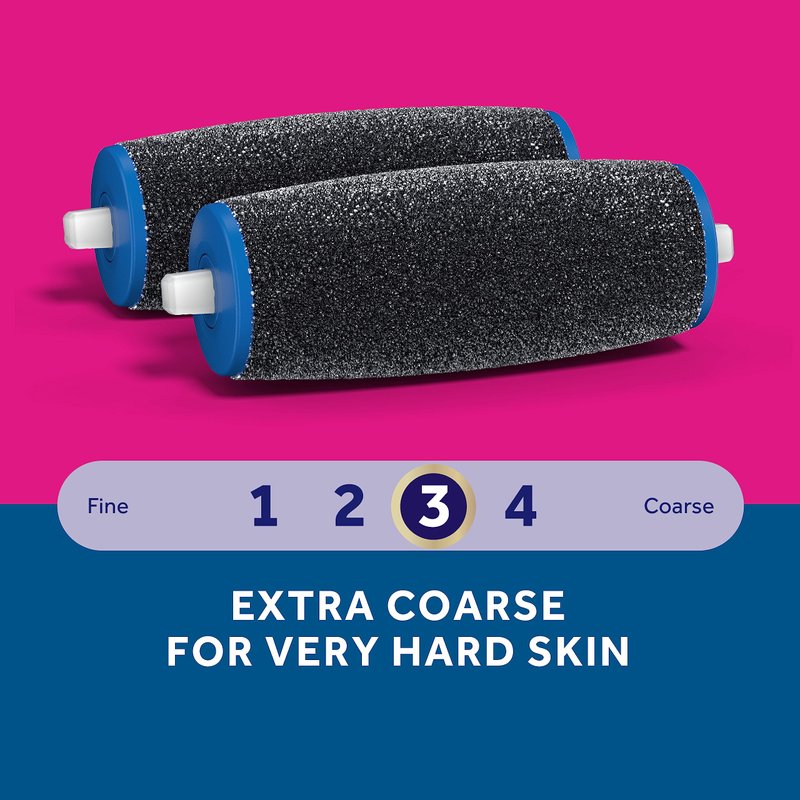 - Use the Extra Coarse roller head for effective removal of very hard skin.