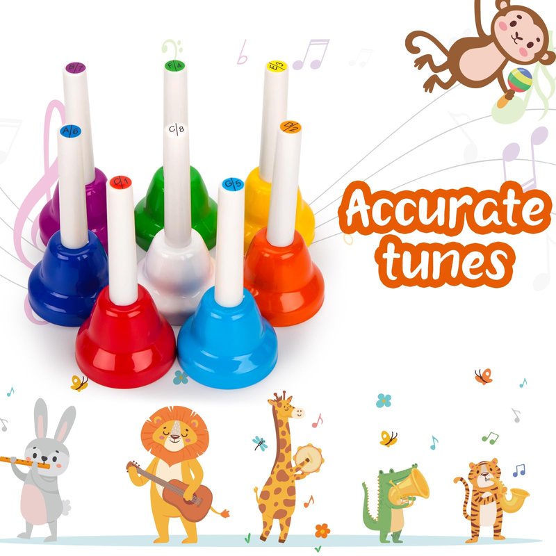 - Premium Package for Budding Musicians - Our music bells set includes 8 chromatic musical hand bells for toddlers, meticulously crafted from durable materials. They are lightweight, well-tuned, and ideally sized for children's hands. To kickstart your child's musical journey.