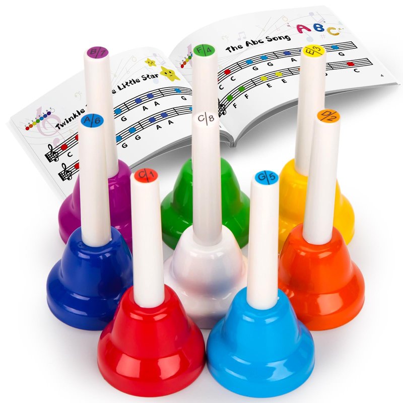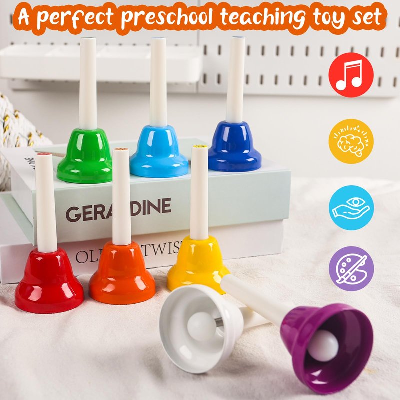 - Unlock the World of Music - This hand bells music set is a stellar early educational toy, suitable for children aged 3 years and up. Featuring 8 notes, each producing clear and rich sounds, these handbells come in bright rainbow colors with diatonic scale positions and tones color-coded for easy learning. These are the perfect hand bells musical instruments.