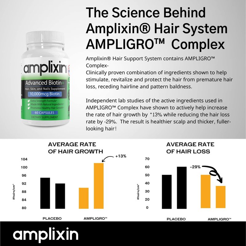 Amplixin Advanced Biotin Hair, Skin & Nails Supplement contains non-GMO and gluten-free ingredients and 10,000 mcg biotin per serving to create an excellent support system for healthy hair growth, healthy skin and nails. Use with other Amplixin products for maximum effectiveness. Manufactured with care in the state of the art facility in the USA.