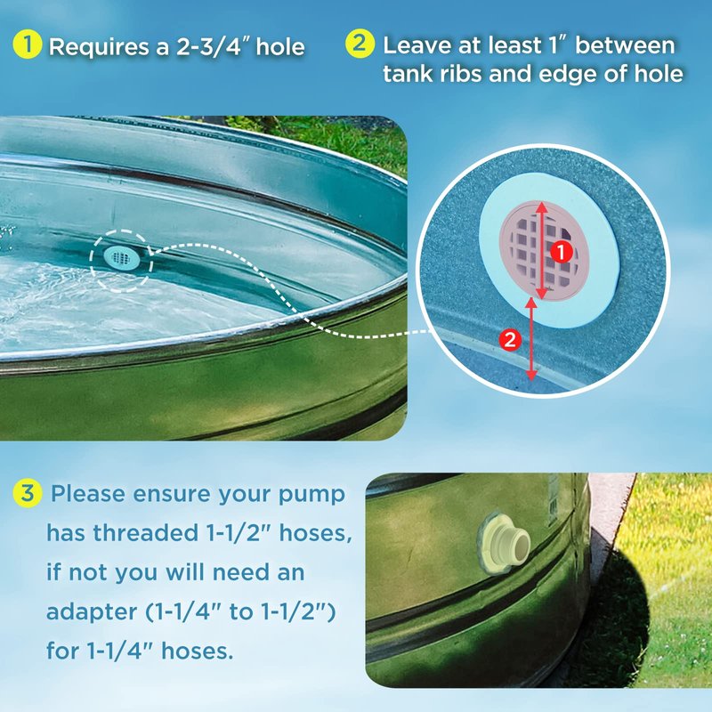 - Inlet strainer for stock tank pools: connect your filter pump and plunger valve to your stock tank