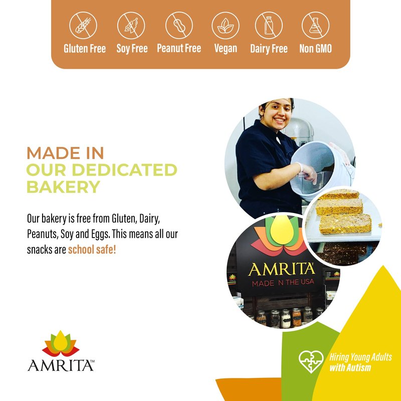 - The Amrita Promise - Enjoy our vegan snacks, crafted in small batches in our allergen-free family-run bakery. We proudly support young adults with autism through our hiring practices and stand by our products with a full money-back guarantee.