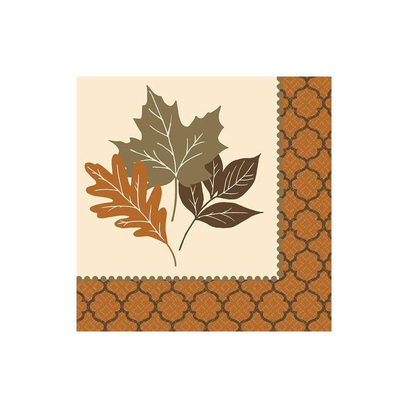 Add our Copper Leaves Beverage Napkins to your fall or Thanksgiving tables! Features an ivory background with fall leaves and a brown quatrefoil border. Napkins measure 5" x 5" when folded. Includes 16 napkins per package.