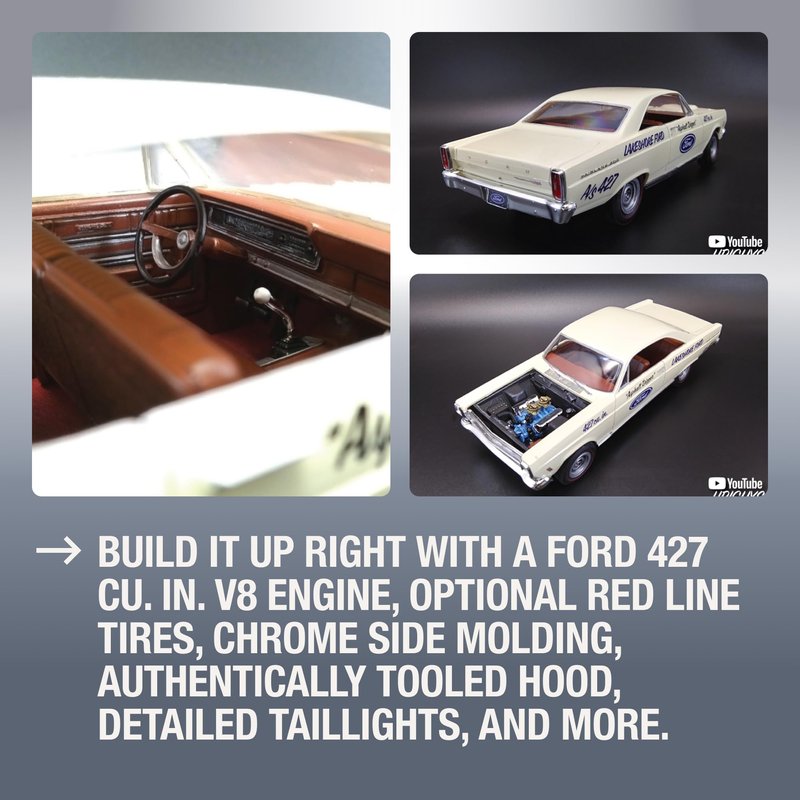 - FEATURE PACKED: The 1966 Fairlane 427 is a historical sleeper, and one of the rarest, muscle cars out there! Fully paintable, it features authentically detailed water-slide decals. Build it up right with a Ford 427 cu. in. V8 engine, optional red line tires, chrome side molding, authentically tooled hood, detailed taillights, and more. Wrapped up nicely in ALL NEW retro-styled packaging!