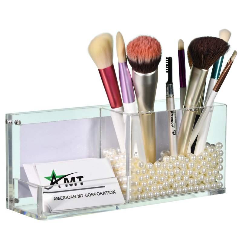 AMT CLEAR Acrylic Make Up Organizer, Business License Frame for Cosmetology or Other Businesses, Makeup Brush Holder, Pen Holder,Business Card Display (Cream)