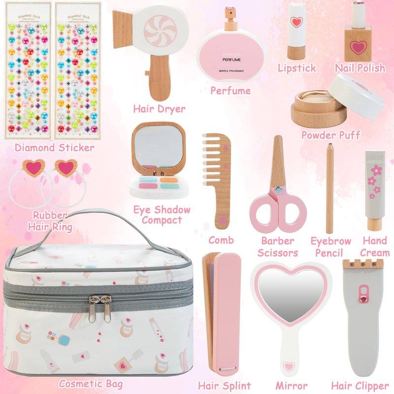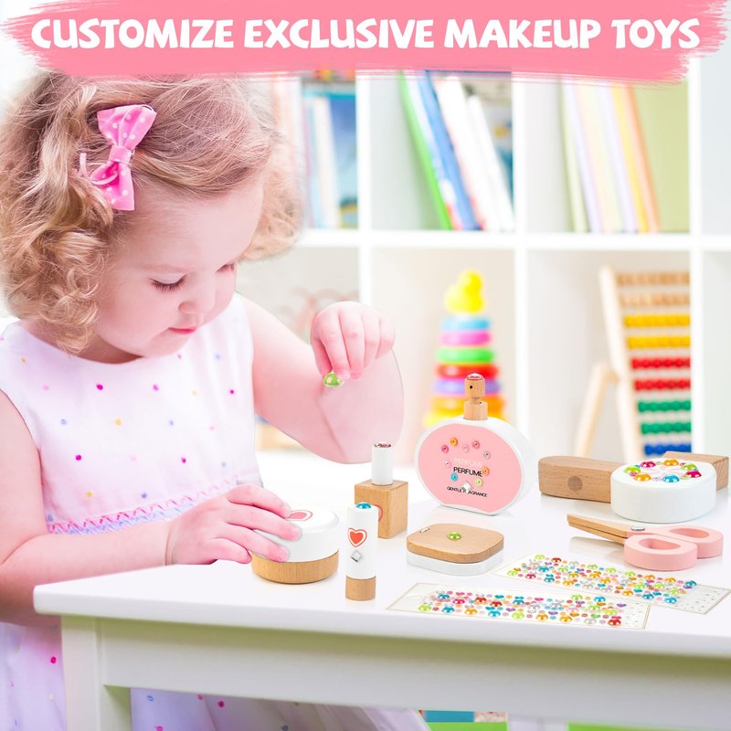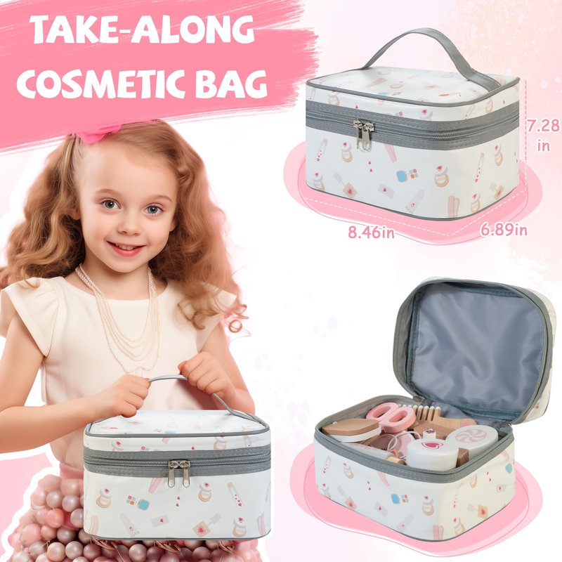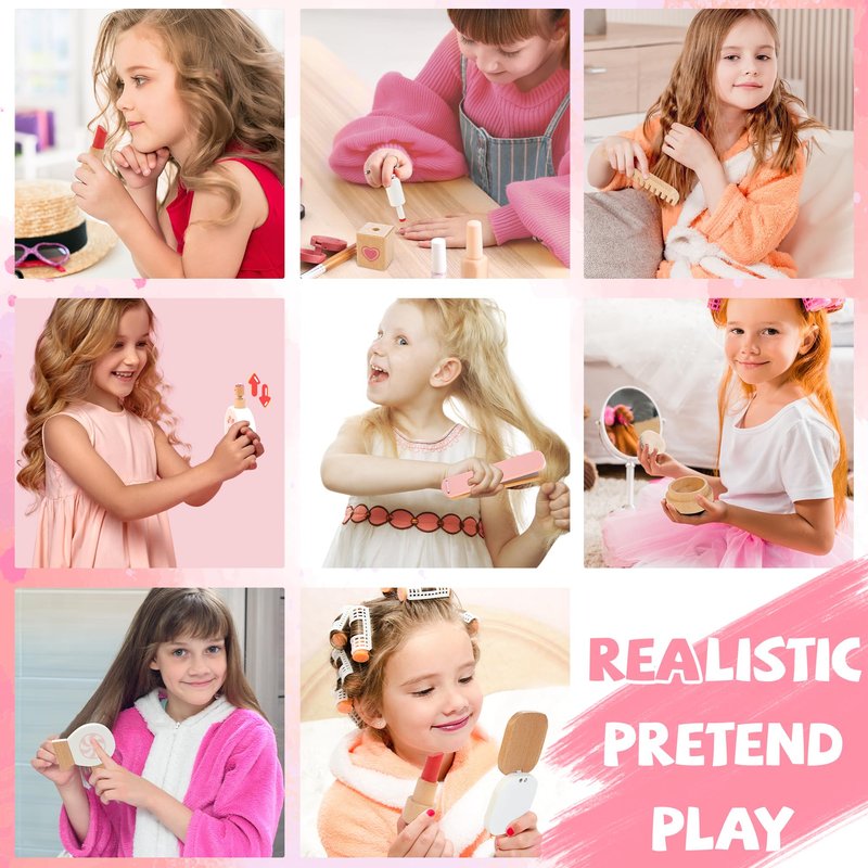 - 【Pretend Play Makeup Kit】Every young girl loves to imitate her mom's make-up and aspires to have her own makeup set. This wooden toy offers children complete freedom to explore their creativity by simulating makeup and hairstyling. It nurtures kid’s curiosity about the world, fostering better communication skills with others
