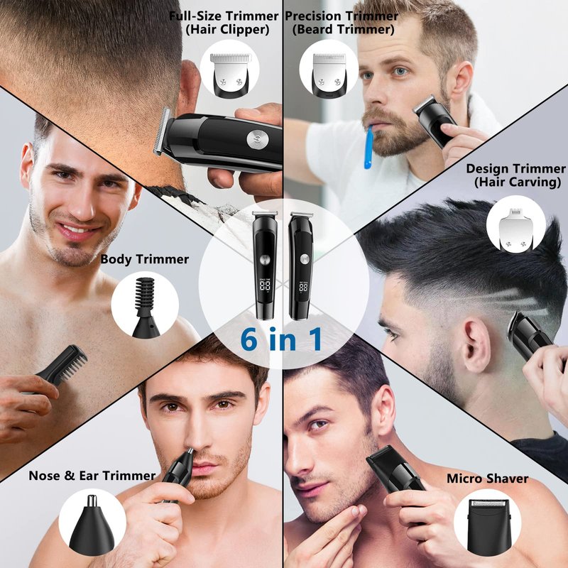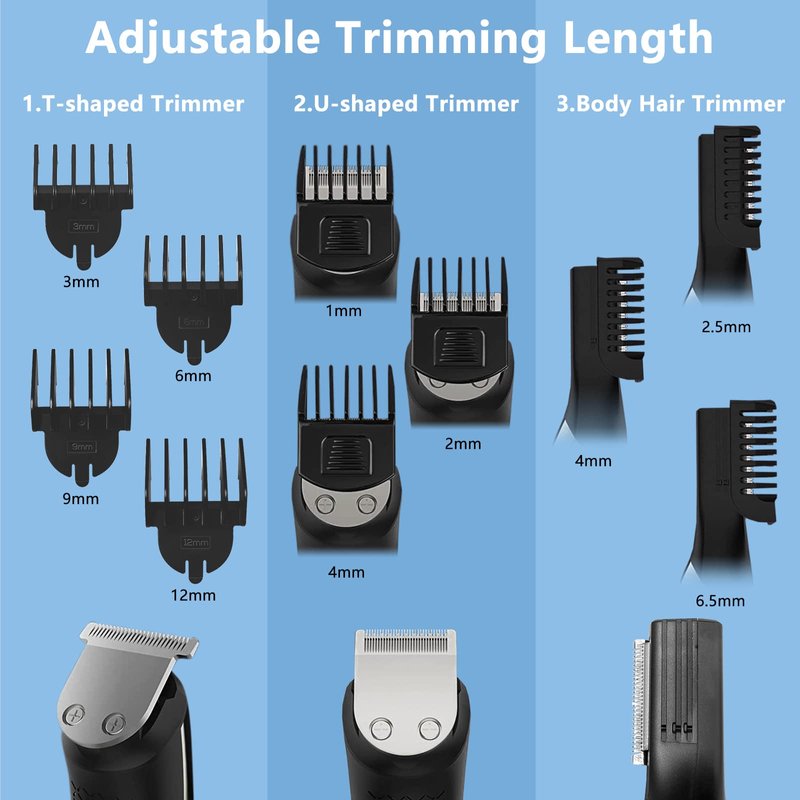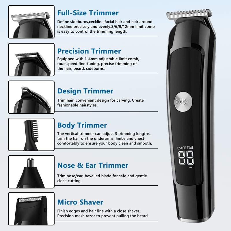- 6 IN 1 Multi-Functional Trimmer Kit: Meet all your daily grooming needs with 6 trimmer heads: full-size trimmer, precision trimmer, design trimmer, body trimmer, nose hair trimmer, and micro shaver. Also includes 5 guide combs(3,6,9,12mm for full size trimmer, 1,2,3,4mm adjustable sideburn combs) for styling your beard, body and intimate areas, as well as moustache, nose, ear and facial hair, or groin.