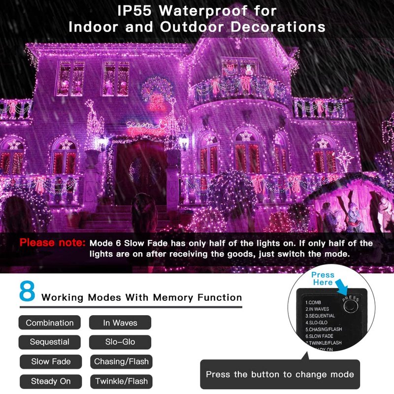LED Christmas lights outdoor Safe to use, these purple string lights are perfect for indoor and outdoor, easy to install, and look great! Brighten up any occasion widely including Halloween parties, weddings, thanksgiving day, gardens, and haunted houses, which will create a spooky and sophisticated seasonal look.Specifications: Color: Warm White / Warm White+Cold White/ Multicolor / Warm White+Multicolor / Blue / Purple Application: Indoor/Outdoor LED Quantity: 300 LED Work Mode: 8 lighting modes Input Voltage: 120V Output Voltage: 30V Waterproof Rate: IP55 Wire Length to First LED: 9.9ft / 3m LED Spacing: 0.3ft / 10cm The first LED to the last LED String Length: 108ftHalloween lights, Christmas lights, outdoor string lights, purple led string lights, purple Halloween lights, purple Christmas lights, twinkle fairy lights.