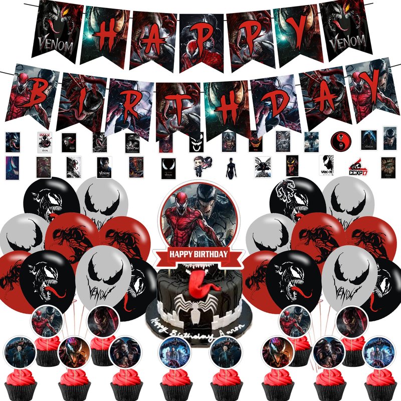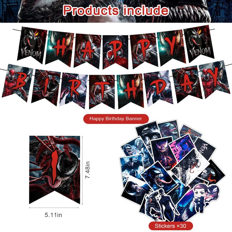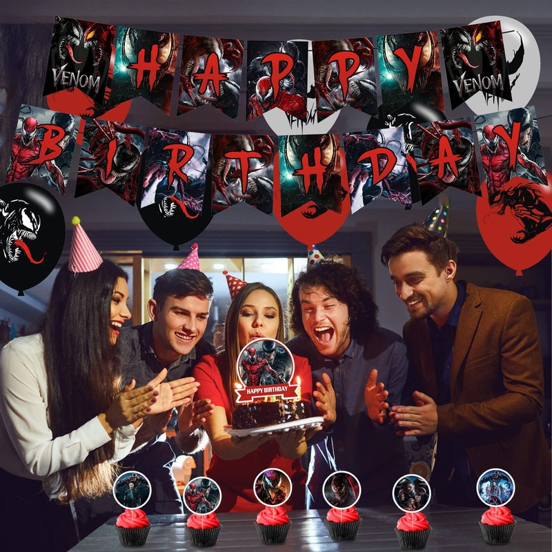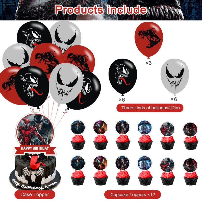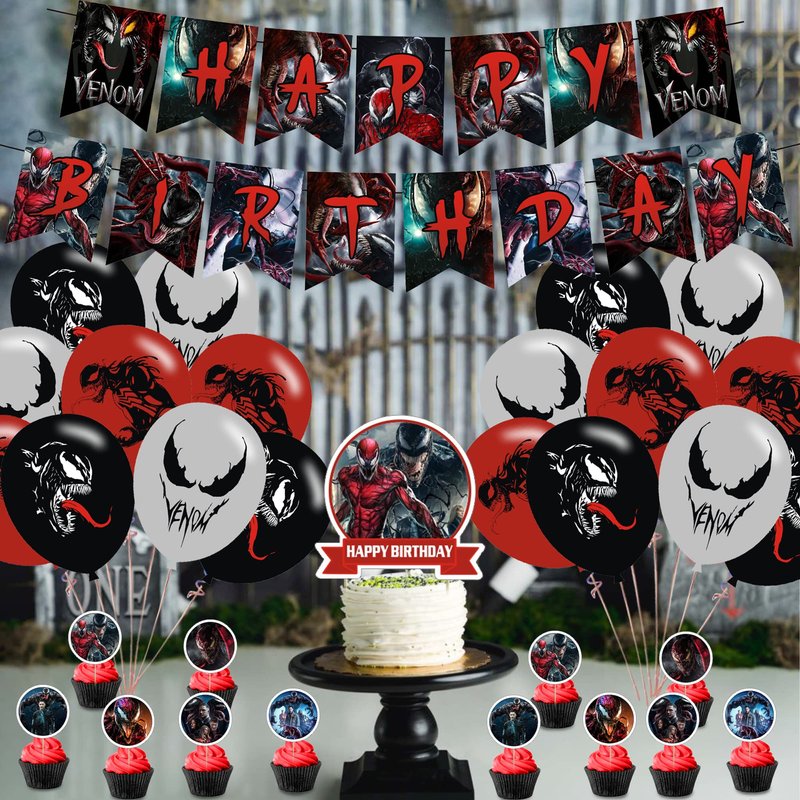 AM/Z Venom 2 Party Decorations,Venom 2 Birthday Party Supplies For Venom Party Supplies Includes Banner - Cake Topper - 12 Cupcake Toppers - 18 Balloons - 30 Venom Stickers