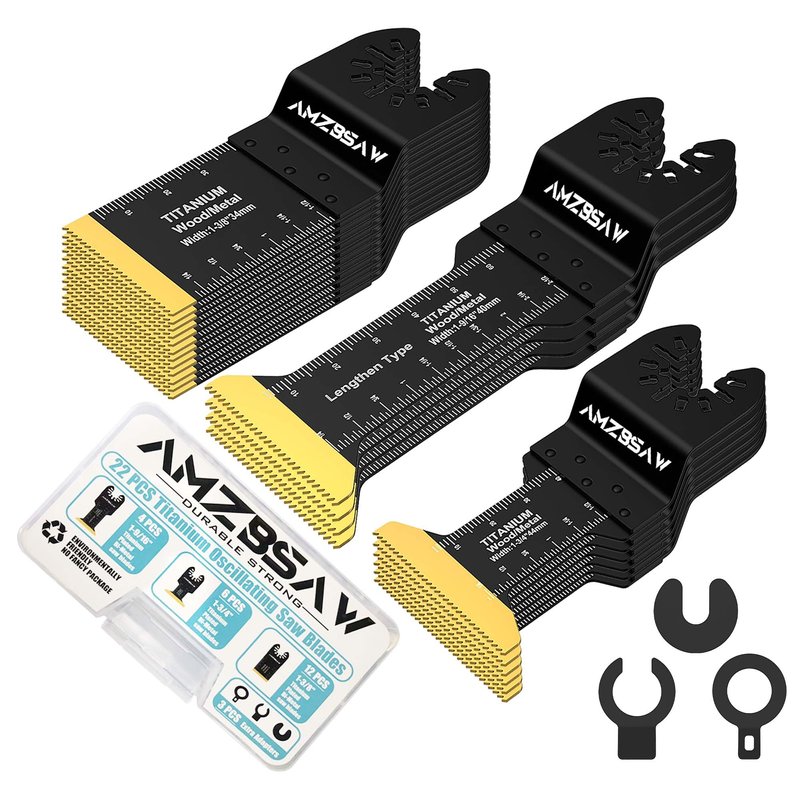 - 【3 Types & 22PCS Titanium Oscillating Saw Blades】Compared with ordinary saw blades, the hardness of titanium saw blades is increased by 50%, and the service life is extended by 2X. Includes 3 different types of oscillating multitool blades, 12pcs 1-3/8"inches, 6pcs 1-3/4"inches, and 4pcs extra long 1-9/16"inches.