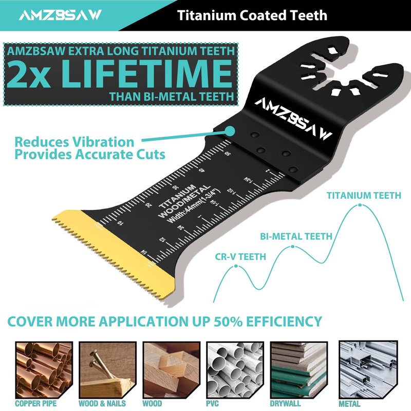 - 【3 Types & 32PCS Titanium Oscillating Saw Blades】Compared with ordinary saw blades, the hardness of titanium saw blades is increased by 50%, and the service life is extended by 2X. Includes 3 different types of oscillating multitool blades, 20pcs 1-3/8"inches, 6pcs 1-3/4"inches, and 6pcs extra long 1-3/4"inches.