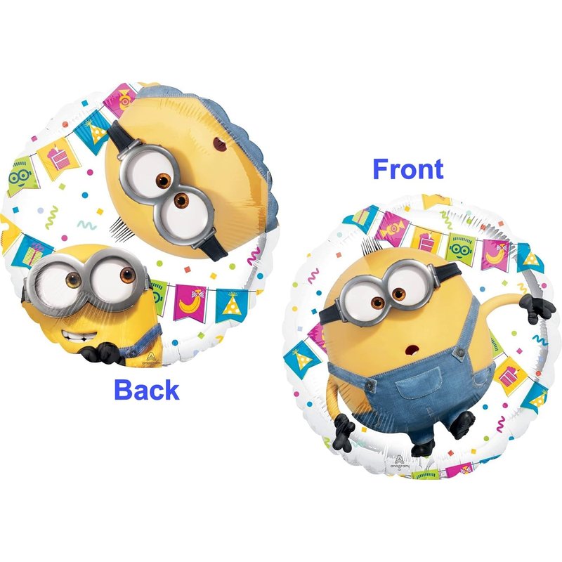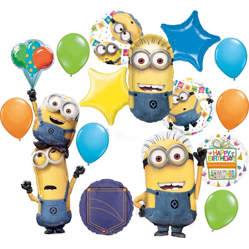 - (1) 26" Minions Pill shape Foil Balloon, (1) 25" Minions SuperShape Foil Balloon, (1) 61" HUGE Minions Stacker Foil Balloon, (2) 18" Minions Round Foil Balloons, (1) 18" Happy Birthday Present Foil Balloons, (1) 18" Denim Jean Pocket Foil Balloon, (2) 19" Star Foil Balloons 1- Yellow, 1- Blue and (6) 11" Latex Balloons 2- Robins Egg, 2- Lime Green and 2- Orange.. Ribbon Not Included. All Anagram Licensed Balloons are Made in USA. Founded in 1977, Anagram International leads the world in innovating and manufacturing foil balloons.