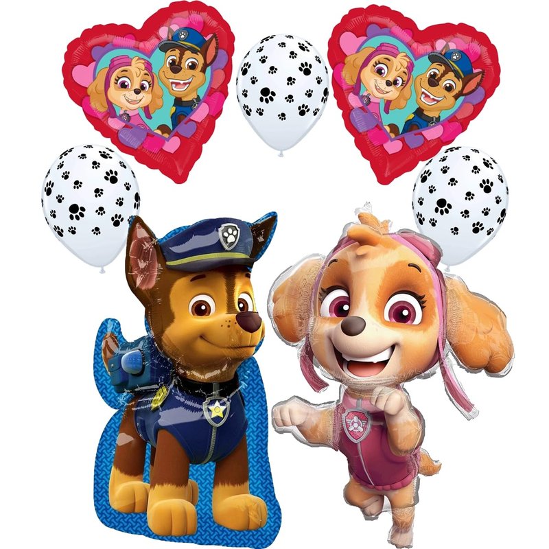 - (1) 31" Jumbo Chase Foil Balloon, (1) 36" Jumbo Skye Foil Balloon, (2) 18" Licensed Heart Shape Chase and Skye Foil Balloons and (3) 11" White Latex Balloons with Black Paw Prints. Ribbon Not Included. All Anagram Licensed Balloons are Made in USA. Founded in 1977, Anagram International leads the world in innovating and manufacturing foil balloons.