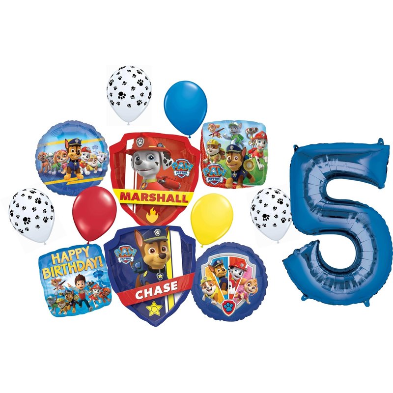 - (1) 34" Giant Blue Number 5 Foil Balloon, (1) 27" Two Sided Chase and Marshall Badge Foil Balloon (image shows both sides of the balloon), (2) 17" Square Characters Foil Balloons 1 Happy Birthday, (2) 17" Round Characters Foil Balloons and (6) 11" Latex balloons 1- Blue, 1- Yellow, 1- Red and 3 White with Black Paw Print. Ribbon NOT Included. All Anagram Licensed Balloons are Made in USA. Founded in 1977, Anagram International leads the world in innovating and manufacturing foil balloons.