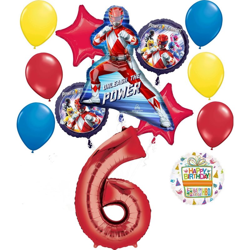 - (1) 34" Giant Red Number 6 Foil Balloon, (1) 27" Red Ranger Power Rangers Foil Balloon, (2) 17" Power Rangers Round Foil Balloons, (1) 18" Mayflower Products Happy Birthday Present Foil Balloon, (2) 19" Red Star Foil Balloon and (6) 11" Latex Balloons 2 each of Red, Blue and Yellow. Ribbon Not Included. All Anagram Licensed Balloons are Made in USA. Founded in 1977, Anagram International leads the world in innovating and manufacturing foil balloons.