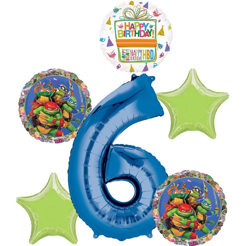 - (1) 34" Giant Blue Number 6 Foil Balloon, (2) 17" Round TMNT Foil Balloons, (1) 18" Mayflower Products Happy Birthday Present Foil Balloon and (2) 19" Lime Green Star Shape Foil Balloons.