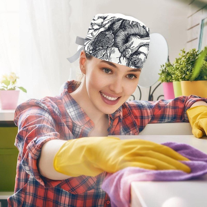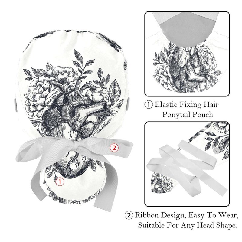 Anatomical Heart with Flowers Scrub Caps Hats Women Bouffant Working Hat Ponytail Holder for Women Long Hair Covers 2PCS