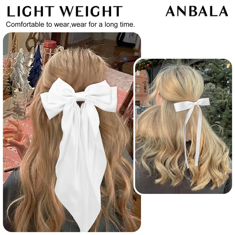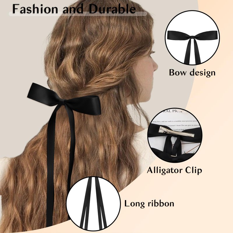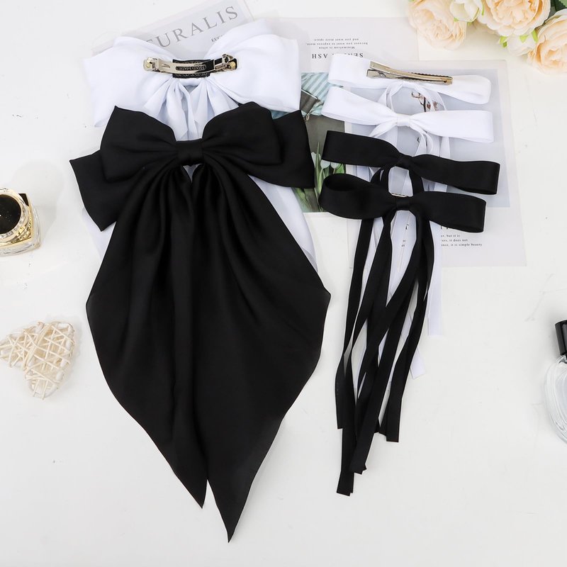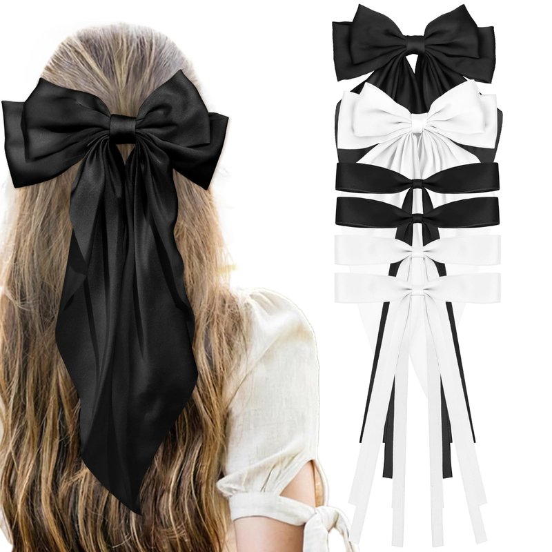 - A Great Value Set:The set contains 4 Silky Satin Hair Bows with Tassel+2 Silky Satin Hair Ribbon Oversized Long Tail Large Big Hair Bows Hair Barrettes Metal Clips. You will all get 6 hair ribbons (White and Black).