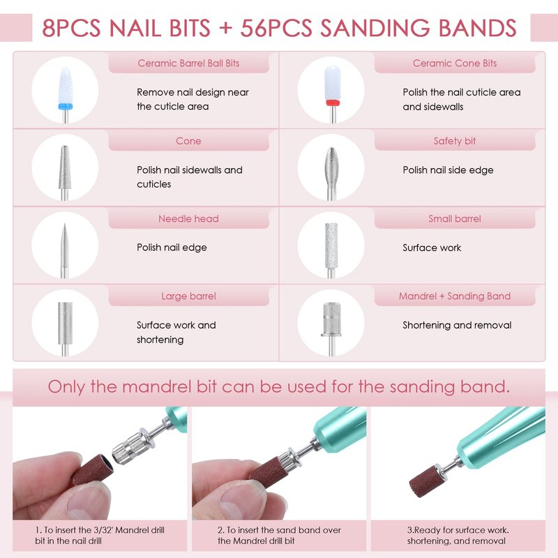 - ❤【Professional Nail Drill Set】: Electric nail file comes with a wide range of accessories to meet any of your needs, 6 commonly used polishing heads, 2 ceramic polishing heads (ceramic polishing heads are sturdy and durable, with high heat dissipation), 56 quality sanding strips and 1 handle holder.