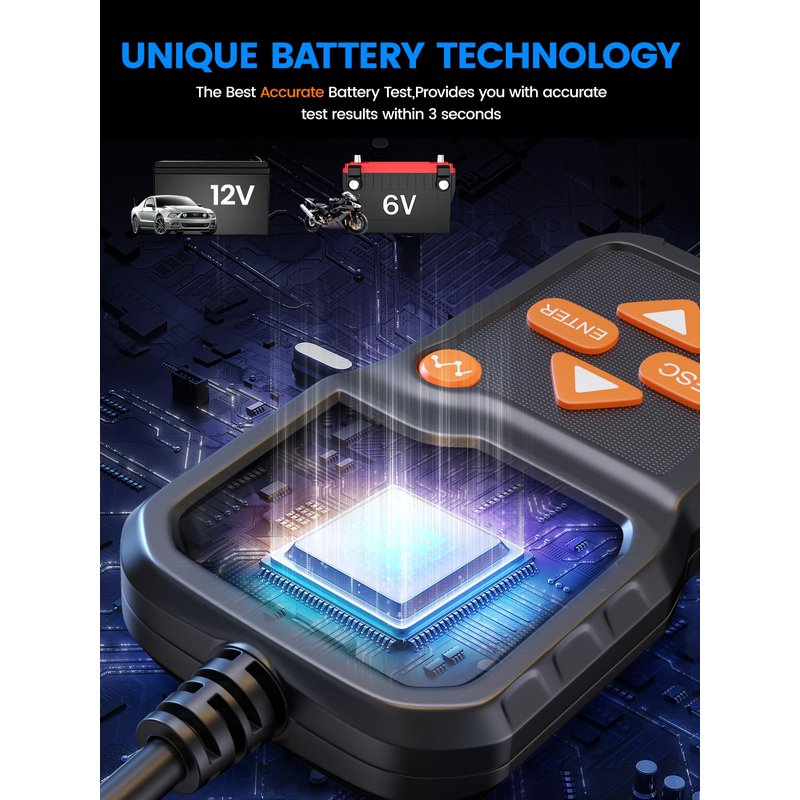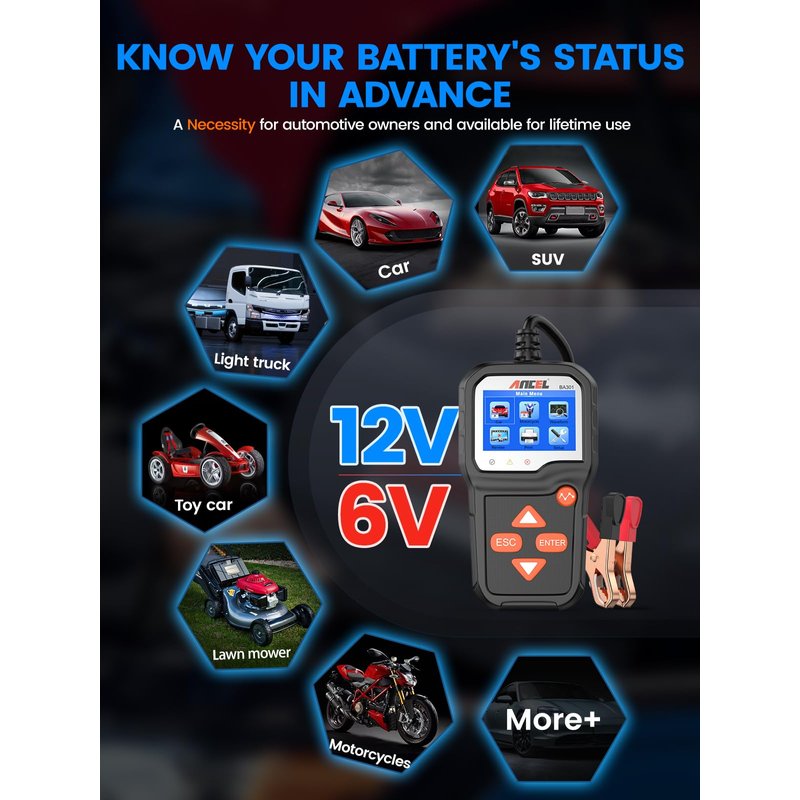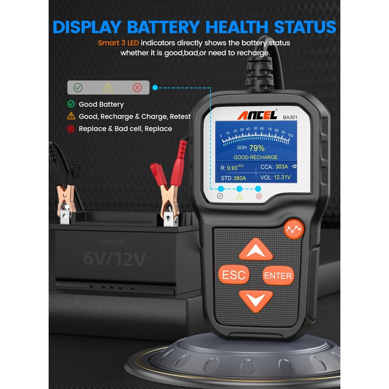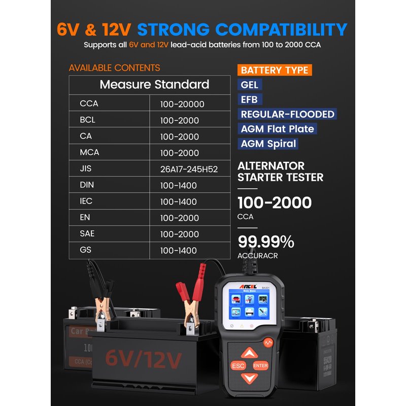 - ✅【6 & 12 Volts Battery Tester】As the upgraded version of BA101 ,BA301 car battery tester can work on all 6V & 12V lead-acid batteries from 100 to 2000 CCA, including regular flood batteries, AGM flat batteries, AGM spiral batteries, GEL and EFB. The perfect car battery tester is suitable for most vehicles, cars,motorcycles, trucks, RVs, ATVs, SUVs, boats, yachts, mowers and even golf carts.etc, and supports most car battery standards, such as CCA, BCI, CA, MCA, JIS, DIN, IEC, EN, SAE.