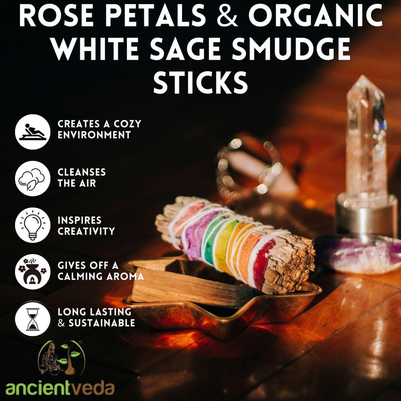 ANCIENT VEDA 3 Pack Rose Petals & Organic 4 Inch White Sage Smudge Sticks with Flowers for Cleansing Home, Meditation, Yoga, Healing & Smudging | Sustainably Sourced California White Sage Bundles