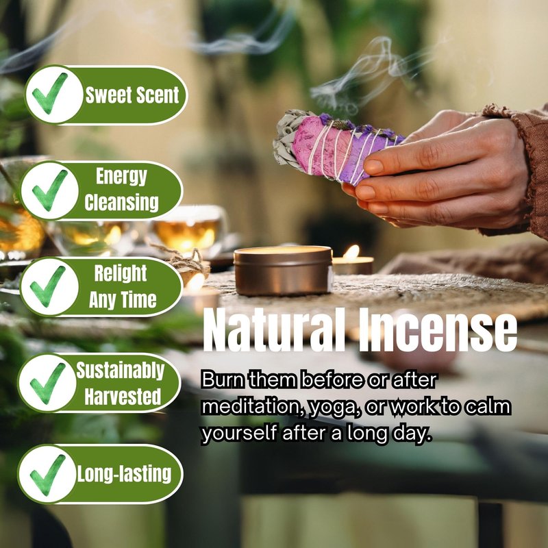 ROSE PETAL FLORAL SAGE: Aromatic white sage and multi-colored rose petals to bless and protect your sacred space or those around you with the virtues of love, strength and power. The combined effects of smudging with rose petals and white sage is known to stimulate love, attraction, romance, sexual arousal, passion, peace, and harmony. USDA ORGANIC SAGE sourced responsibly in California proven to neutralize negative vibrations, improve sleep, as well as alleviate anxiety and stress. When burned the smoke heals and brings one back into balance and cleanses the body and mind of negative spirits and impurities. Smudging sage has also been known globally to help relieve worry, open the mind, clear negative thoughts and feelings, and decompress the spirit. PRACTICE A SACRED TRADITION Sage is a traditional medicine plant of the Native American peoples, used for healing and ceremony. It is used for cleansing and purification, and to open people up to a greater connection with the sacred. It is thought to banish negative energy, not only on the physical level, but also emotionally, mentally and spiritually. Sage has a very aromatic, sharp and stimulating smell, and its action works on all the senses. USE FOR YOGA AND MEDITATION Smudging with sage is a powerful tool in spiritual practice. Burning sage improves awareness and focus. It commonly used to practice mindfulness and transcendental meditation. THE ESSENTIAL SMUDGE GUIDE Smudging how-to written in layman's terms. This essential guide details everything you will need to know to become a shaman-level smudging pro.