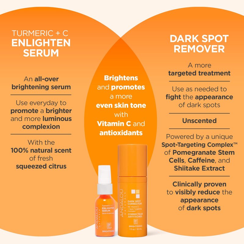 - BRIGHTENING SERUM FOR FACE: Support skin vitality with Andalou Naturals Turmeric + Vitamin C Serum. This face brightening serum targets uneven skin tone, dark spots and signs of aging, leaving your skin looking brighter and more youthful