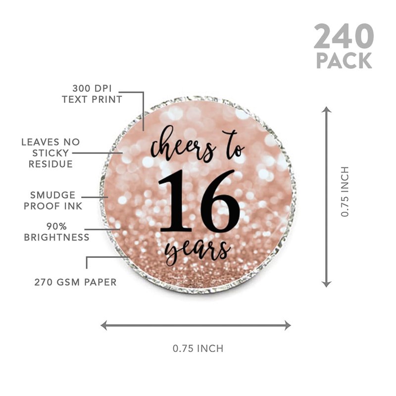 Andaz Press Glitzy Faux Rose Gold Glitter Milestone Chocolate Drop Labels, Cheers to 16 Years, Sweet 16 16th Birthday or Anniversary, 240-Pack, Not Real Glitter, Kisses Party Favors