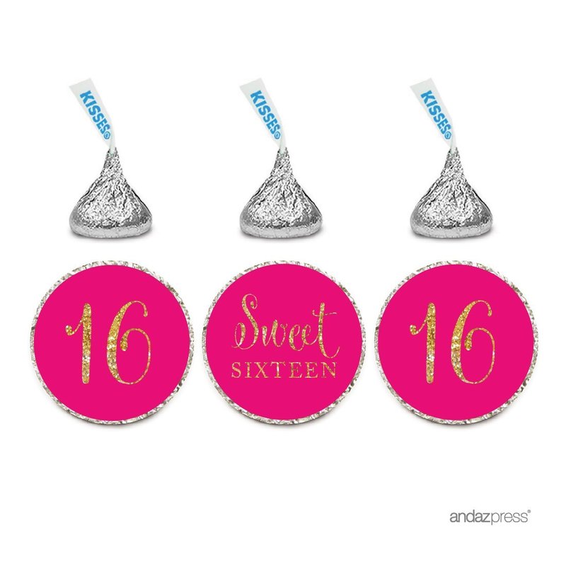 Andaz Press Gold Glitter Print Chocolate Drop Labels Stickers, Sweet 16 Birthday, Fuchsia, 216-Pack, Not Real Glitter, for Kisses Party Favors