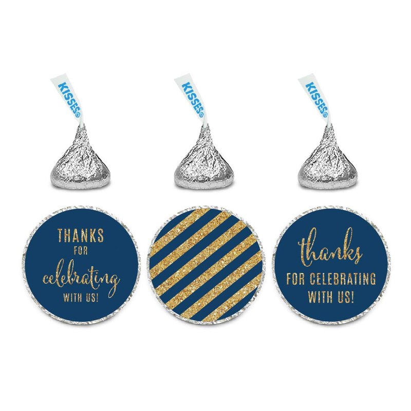 Andaz Press Gold Glitter Print Chocolate Drop Labels Stickers, Thanks for Celebrating with Us Striped, Navy Blue, 216-Pack, Not Real Glitter, for Kisses Party Favors