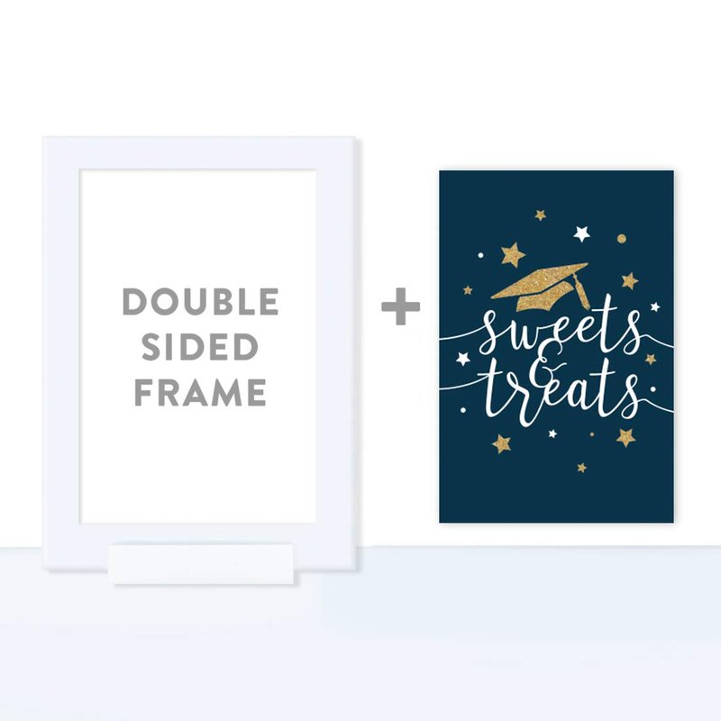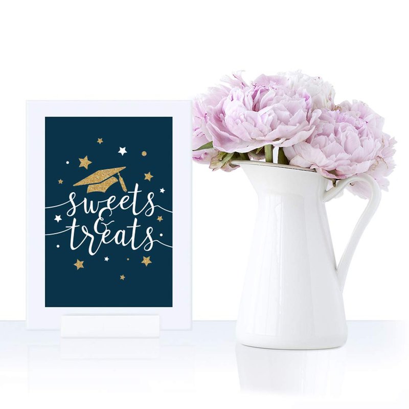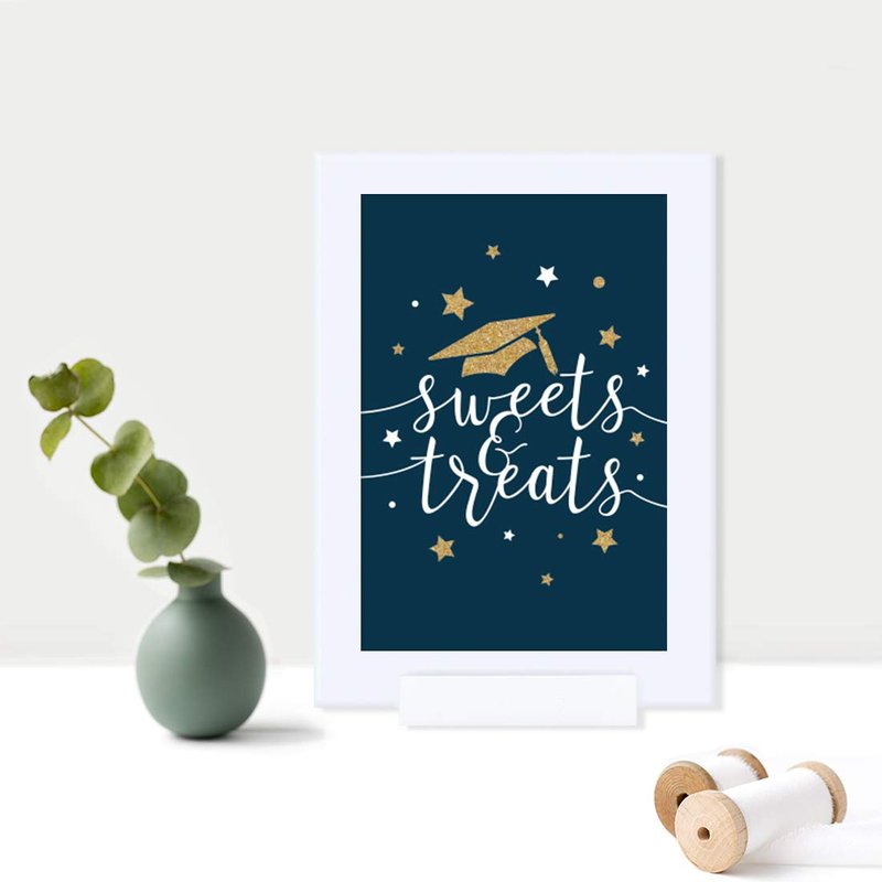 Andaz Press Navy Blue and Gold Glittering Graduation Party Collection, Framed Party Sign, Double-Sided 4x6-inch, Sweets & Treats, 1-Pack, Includes Reusable Frame