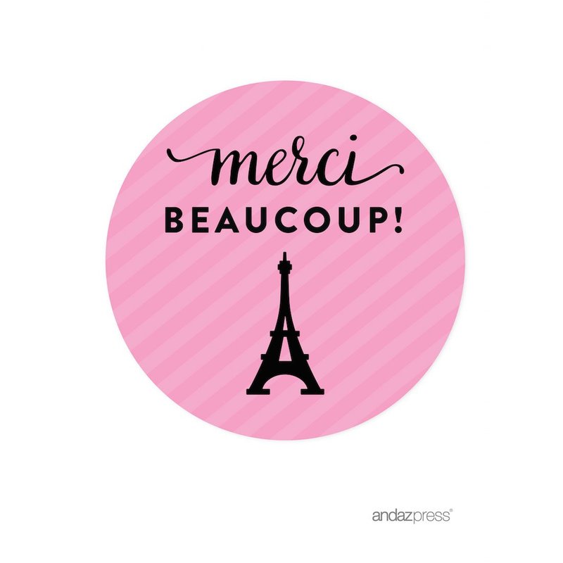 Andaz Press Paris Bonjour Bebe Girl Baby Shower Collection, Round Circle Label Stickers, Merci Beaucoup!, 40-Pack, Paris France, Travel, Pink Themed Party Decorations