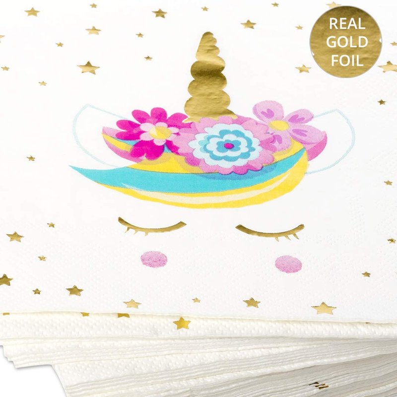 - SERVES 12 GUEST PARTY SET. Modern tableware party set includes 12 plates 9-inch, 12 plates 7-inch, and 40 6 ½ inch square lunch paper napkins. Plate set features unicorn with real gold foil unicorn horn detail exclusively designed by Andaz Press .